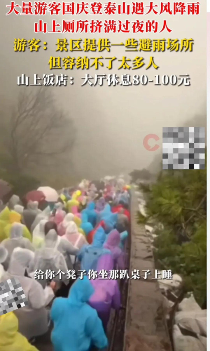 还有一部分不甘心花钱买座位的游客,选择了冒雨连夜下山。湿滑陡峭的台阶,疲惫不堪的身体,这段下山路走得异常艰辛。而留在山上的人,要么挤在厕所,要么掏钱买了“座位”,在泡面的香气和此起彼伏的鼾声中,度过了这个毕生难忘的国庆之夜。