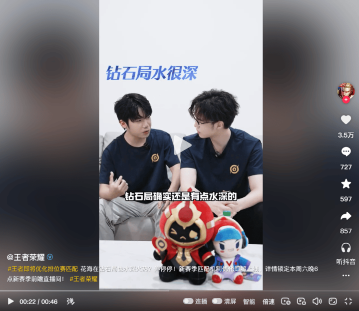就连职业选手也逃不开这种体验。今年7月,甚至传出职业选手“花海”上不去王者的传言,虽然后来他亲自澄清是营销号造谣,但他自己也承认,赛季初的钻石局确实“水很深”,难打是真的。这也从侧面说明,机制本身还存在优化的空间。