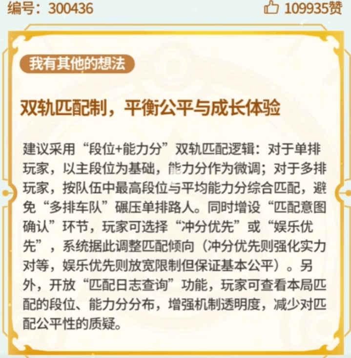 而玩家这边,也积极响应这种开放的态度,提出了许多建设性意见,比如有玩家表示能不能出一个类似“小黑屋”的模式,将信誉较低的玩家们分流在一起;又或者建议减少两边的方差,不让队伍差距变大;也有玩家提出“双轨匹配机制”,得到了许多玩家点赞……