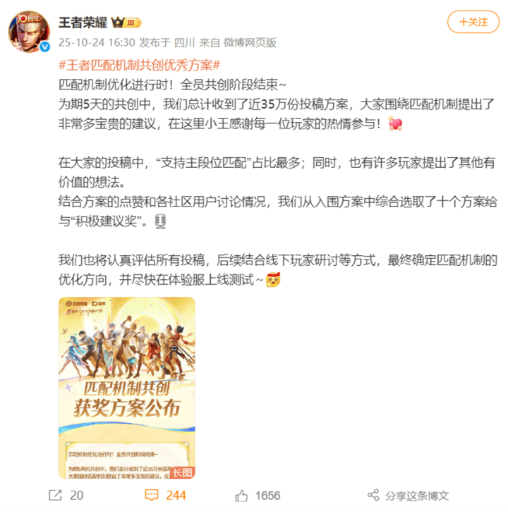 值得注意的是,这一改动并非项目组脑袋一拍就想出来的,而是在收集了近35万份投稿问卷后,综合统计得出。从8月底发布匹配优化的专项沟通,到10月份的“共创计划”开启,最后在11月份开启灰度测试,并计划在新赛季全量上线,前前后后已历经数月时间。